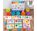 Contenido: 10 tarjetas para contar del 1 al 10 piezas, 10 piezas de los números del 1 al 10 en alto relieve, cuentas de madera de los colores del arcoíris, 7 recipientes de colores del arcoíris, 1 pinza de madera, 1 cuchara de madera y 2 palitos de madera.